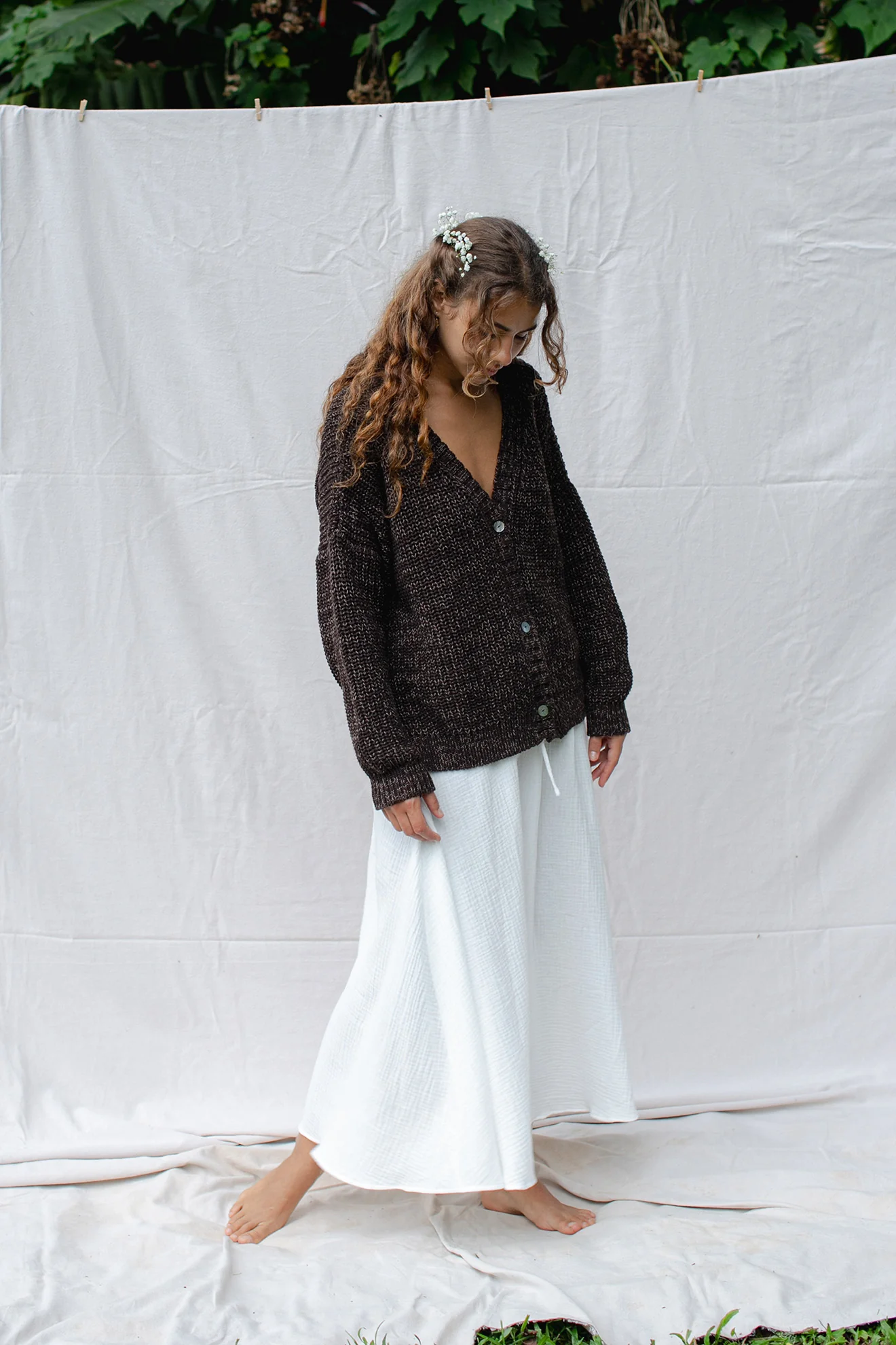 Our beloved Helga Cardigan, designed to soften the challenges of everyday life, this cool and comfy knit has a chunky structure that is soft, loving and full of personality. Her weight will shape to the uniqueness of your body. The natural fibres make her a dream to wear and the perfect trans-seasonal piece for cosiness in Autumn and Winter and the cool evenings of Summer and Spring. Her beautiful weight makes you feel held and hugged throughout the whole year and holds your body with so much love.