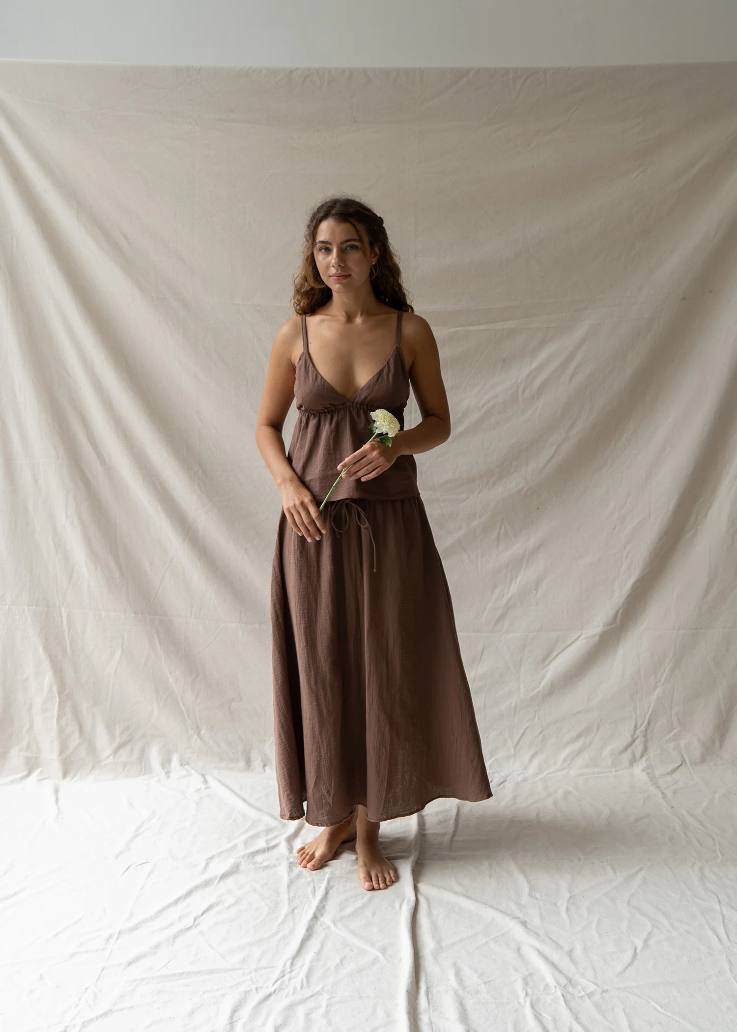 Introducing our Mökki Skirt, now available in a rich Walnut colourway. This deep, sophisticated tone, hand-dyed by our dedicated artisans in Bali, complements a variety of styles and occasions. It's our favourite timeless skirt, perfect for transitioning from soft mornings to enchanting evenings.